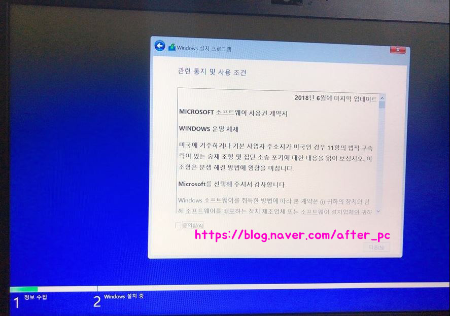 관련 통지 및 사용 조건 [ 동의함(A) ]을 체크하고 다음(N)을 눌러 넘어갑니다.