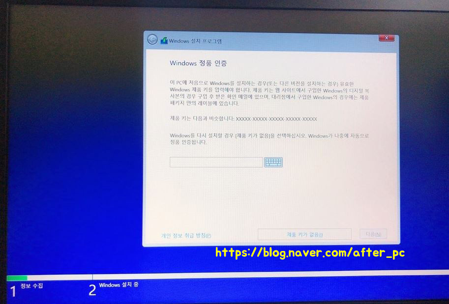 정품 인증 CD-KEY(라이선스)가 있다면 입력해주고, 없다면 [ 제품키 없음 ]을 누르고 다음으로 넘어갑니다