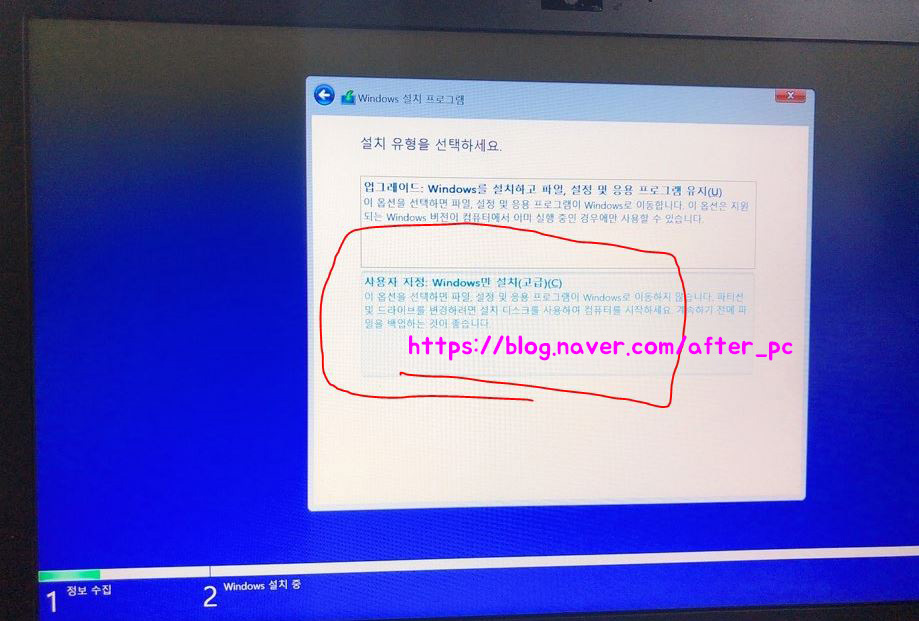 [ 사용자 지정 : Windows만 설치(고급)(C) ]를 선택합니다