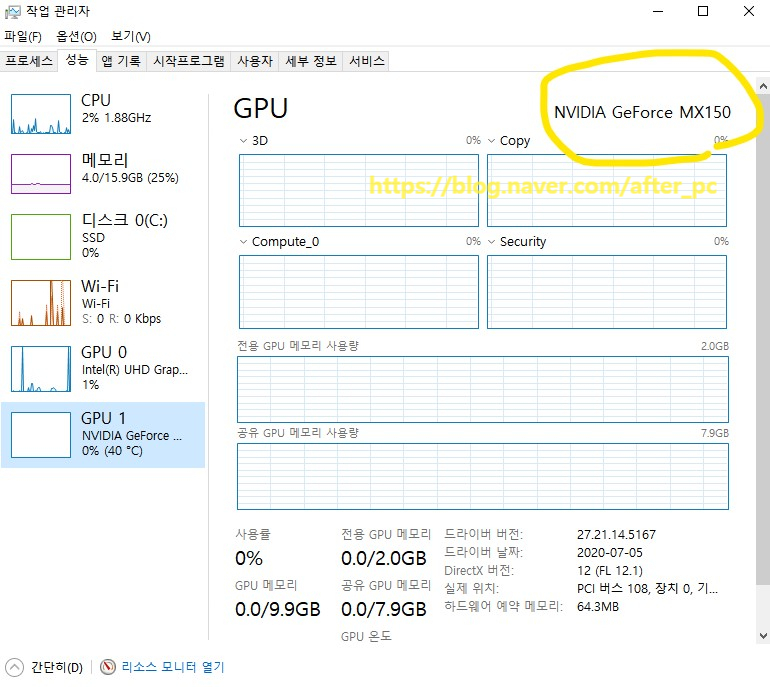 외장 그래픽인 GPU 1 [ NVIDIA GeForce MX150 ]는 안경이라고 생각하시면 이해가 편할 것 같습니다.