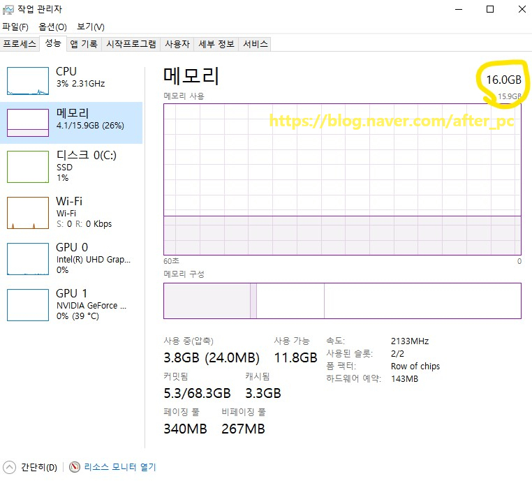 사진에서 확인되듯이 현재 제 PC의 메모리 사용량은 4.1GB를 사용 중이고요