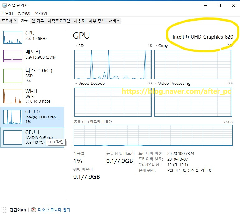 내장 그래픽은 GPU 0 [ Intel(R) UHD Graphics 620 ]은 눈이라고 생각하시면 되고,