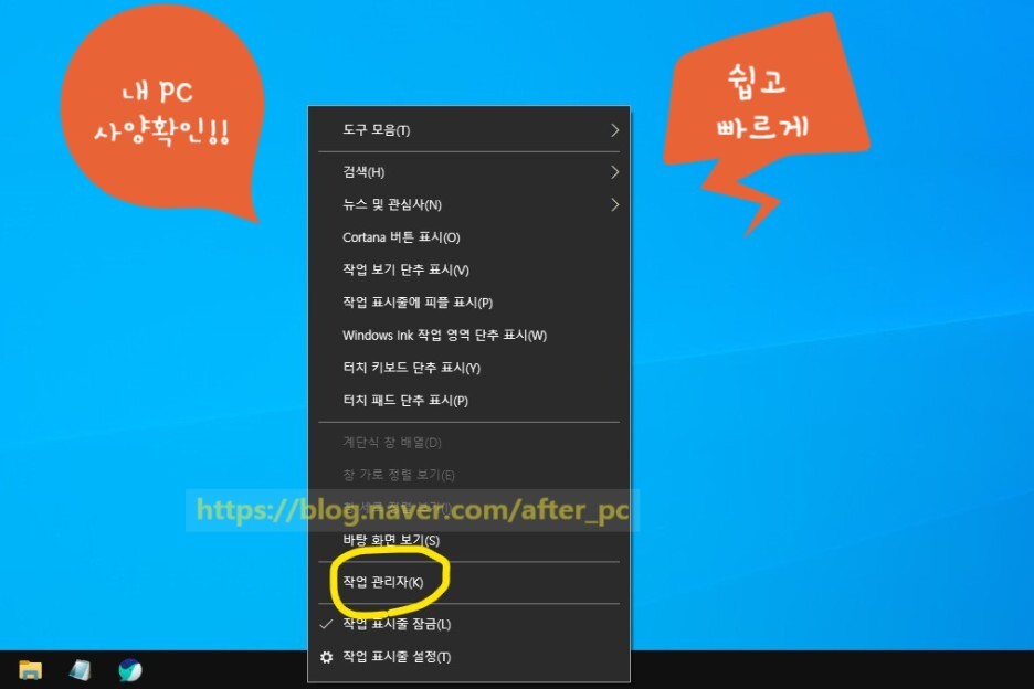 우선 바탕화면 아래에 있는 작업표시줄에서 마우스 오른쪽 클릭해보면 해당 메뉴가 확인됩니다.