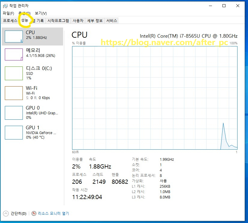 메뉴에 있는 [ 작업관리자 ]를 선택 후 두 번째 탭에 있는 [ 성능 ]을 클릭합니다