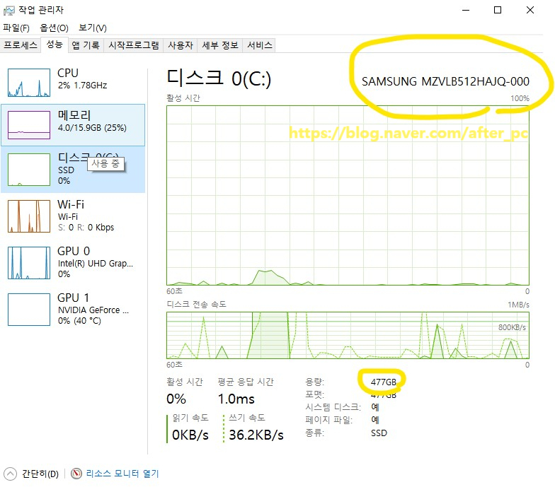 아래에 용량에서 크기 [ 477GB ]를 확인할 수 있습니다.