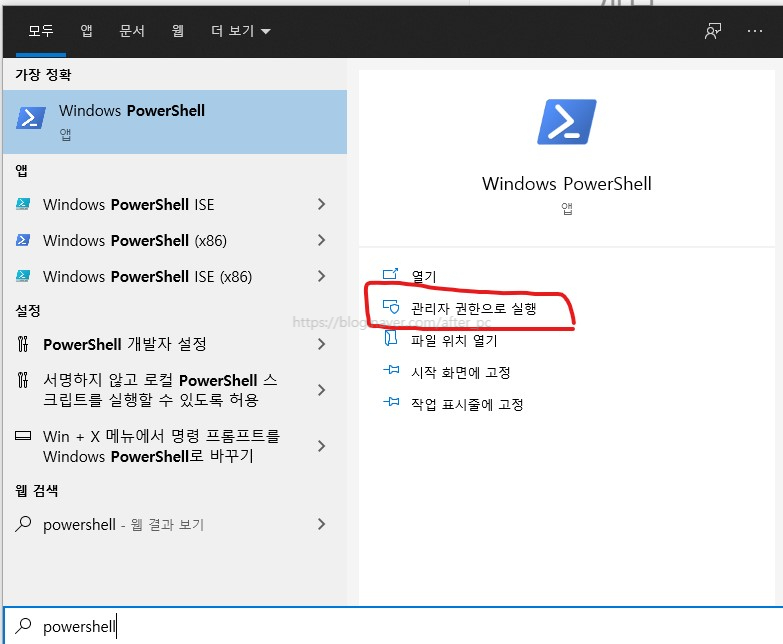 시작메뉴 옆에 있는 돋보기를 클릭 후 [ powershell ]을 검색하셔서 오른쪽에 있는